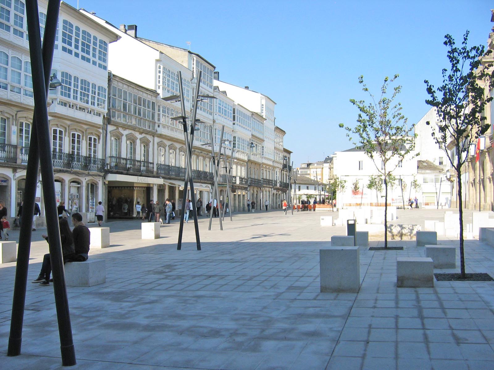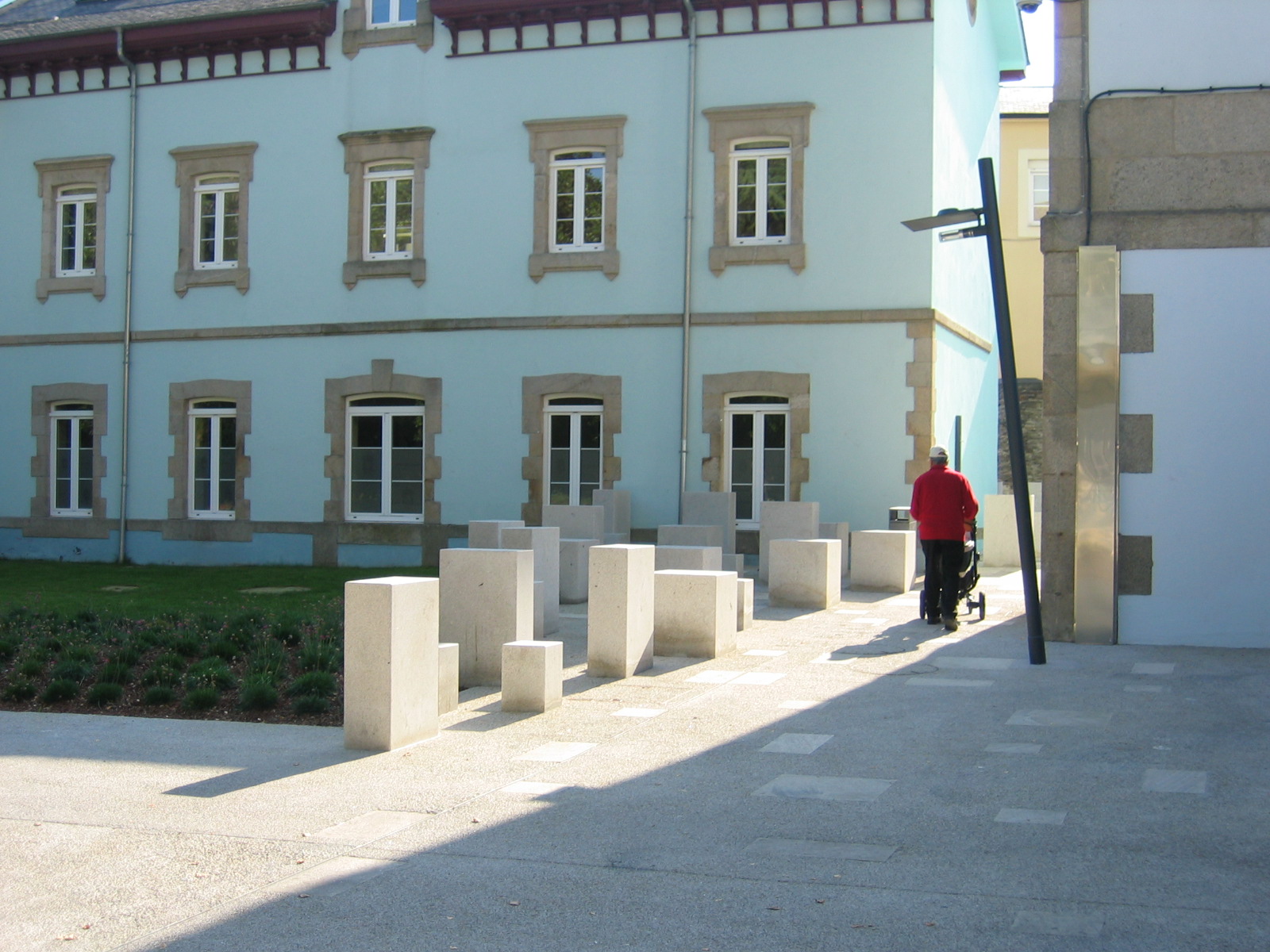 Una calle se transforma en una Plaza: zonas para estar, para vivir, para representar…; se convierte en un espacio que envuelve el edificio institucional que lo preside y penetra en el espacio verde privado de acceso a los garajes para transformarlo en un lugar ordenado, silencioso, estimulador de los sentidos: colores, texturas, olores, volúmenes… El jardín invade lo urbano; lo urbano invade el jardín.
